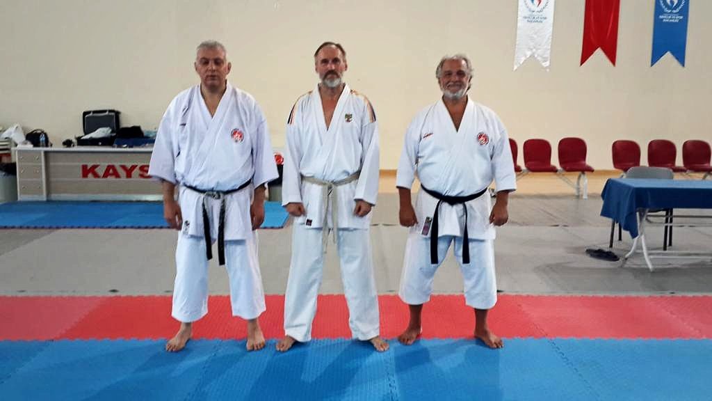 links Karatemeister und Gastgeber Mustafa Altinok 6.Dan, Jürgen Mayer Mitte und Legende Atilla Celiktürk 8.Dan