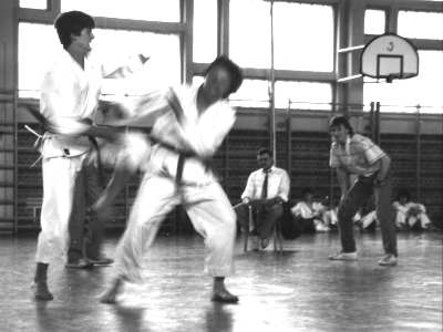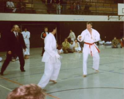 Februar 1987: Freikampf mit Bart, beim Lehrgang mit Europameisterin Silvia Wiegärtner (jetzt verheiratet mit Dr. Oliver Schnabel) | Juli 1988: Vergleichskampf gegen Ungarn in Regensburg. Ich startete in Kata und Kumite, im Hintergrund Kampfrichter Albert Schindler jun. Ex-Präsident des DKV u. BKB |