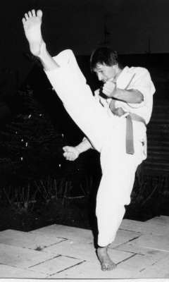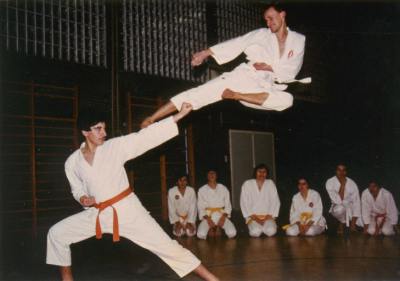 1980 mehrere Jahre Weißgurt 8.Kyu! im 10 Kyu-System des DOSHINKAN Karate mit der Technik YOKO-TOBI-GERI nach 2 Jahren Training, Ort: Turnhalle der Realschule in Lauf |