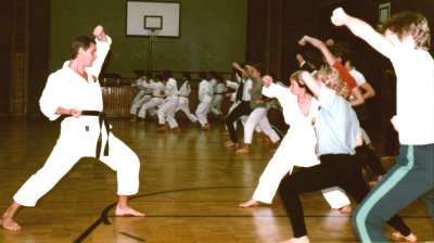 1982 im Frühjahr, mein erster SHOTOKAN-Trainer Josef Marok leitet den Anfängerkurs (TH Realschule Lauf). Ich, mit Grüngurt 6.Kyu, trainiere die Oberstufe im Hintergrund |