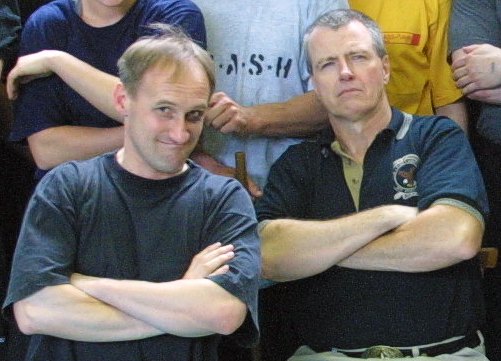 Mai 2003: Jürgen Mayer und der aus TEXAS/ USA extra eingeflogene SV-Trainer Hock Hochheim. Der Trainer vieler Polizei- und militärischer Spezialeinheiten faszinierte durch unglaubliche Präsenz und Techniksicherheit, wie durch sein schier unerschöpfliches Wissen. Die Erfahrung als Militär und Ex-Polizist fließen in sein realistisches Training mit ein.