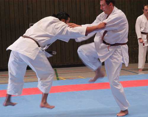 ![]() Foto links: DAN-Prüfung im November 2003 Techniken seiner 1. DAN Schwarzgurt-Prüfung. Selbstverteidigung/ BUNKAI gegen Griffansatz |