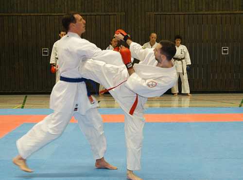 Christian kontert seinen MAWASHI-GERI CHUDAN gerade mit einem GYAKU-ZUKI CHUDAN ab.