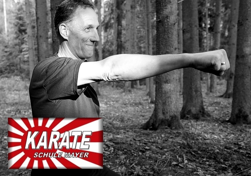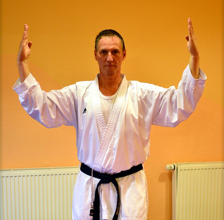 Foto oben: Yama-Gamae eine Technik aus Christan`s Kürkata zur 2.DAN Prüfung Hangetsu 半月 "Halbmond" (alter Name Seisan): Yama-Gamae "Bergstellung", weil das japanische Schriftzeichen für Berg 山 wie die Endstellung dieser Armtechnik ausschaut!