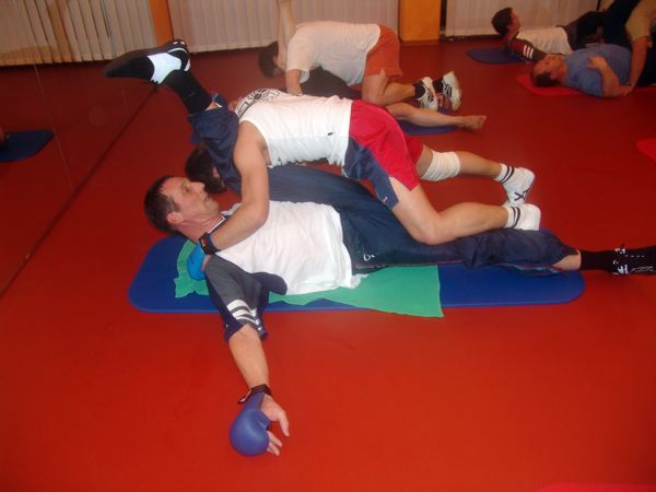 Foto oben: Extrem dehnfähig für einen so großen Mann ist Christian - hier beim Kickbox-Workout im Februar 2007 mit Jürgen Mayer im Fitness-Studio NORICA