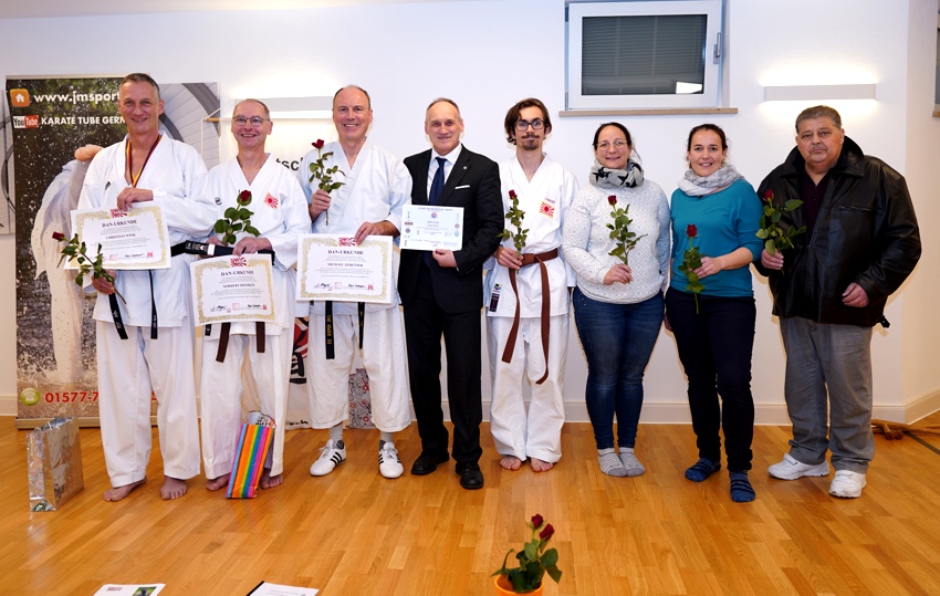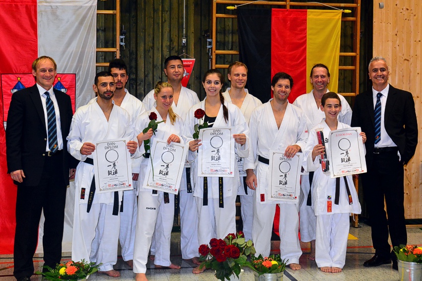 Foto oben: Meistergrade im Karate Dezember 2013/ Gruppenbild der Karate-Schwarzgurte mit den Prüfern