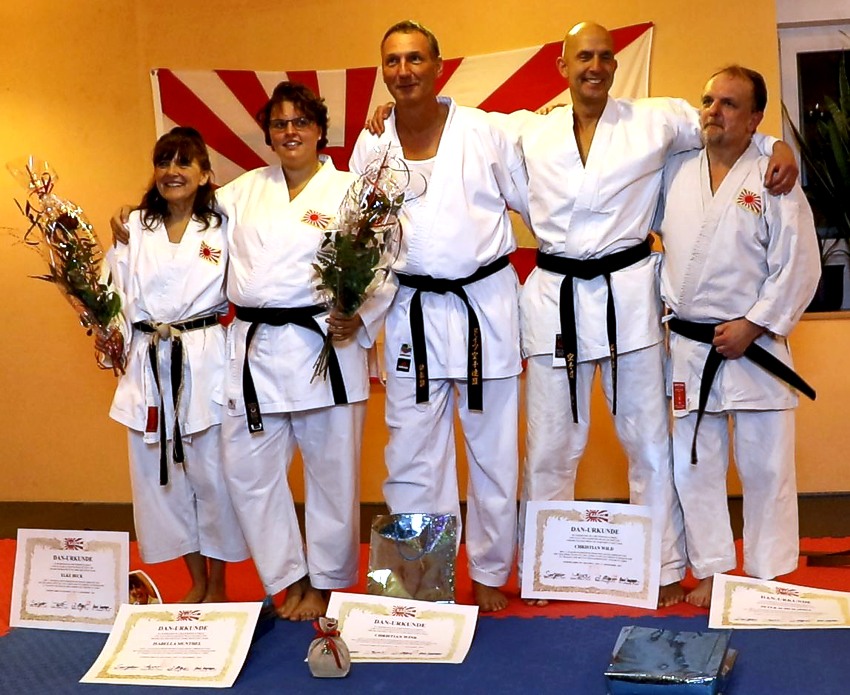 erreicht/ Gruppenbild der neugraduierten Schwarzgurte, der Prüfer und Orga